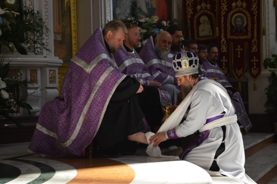 По окончании Литургии Владыка совершил «чин омовения ног». Во время этого чина архиерей, в знак глубокого смирения и служения народу Божию, омывает ноги сидящим священнослужителям.