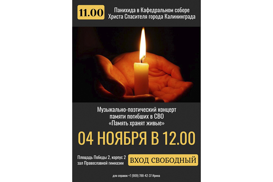 4 ноября в Кафедральном соборе Христа Спасителя г. Калининграда в 11.00 будет отслужена панихида по воинам, погибшим во время Специальной военной операции.После панихиды в 12.00 в актовом зале Православной гимназии г. Калининграда (пл. Победы, 2, корп. 2) состоится музыкально-поэтический концерт памяти погибших в СВО «Память хранят живые». Вход свободный.