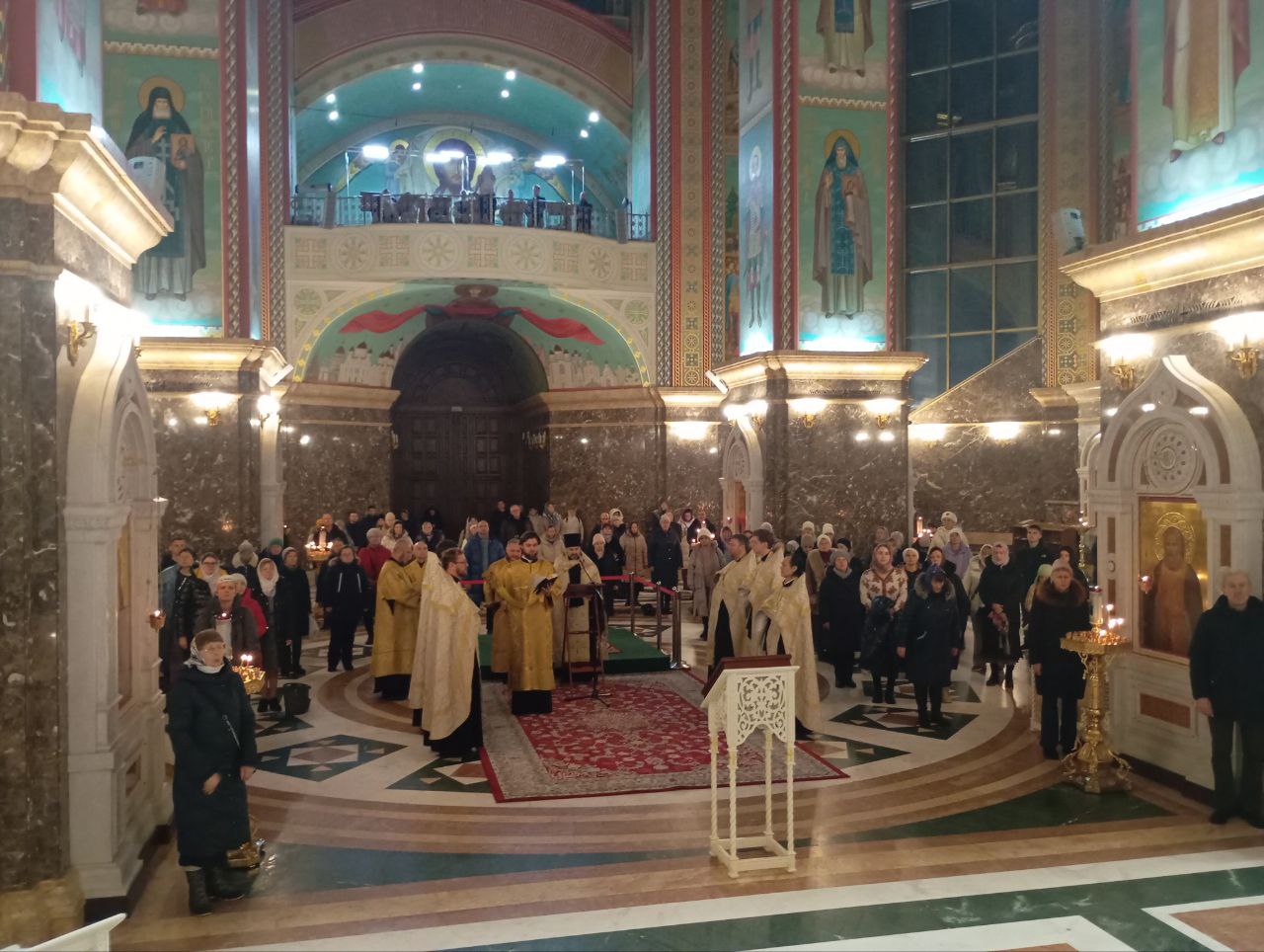Богослужение возглавил ключарь собора протоиерей Михаил Селезнев. Ему сослужило духовенство собора. Под сводами величественного храма в этот вечер звучали особые прошения. В молитвенных песнопениях верующие просили Господа о ниспослании мира, о благорастворении воздухов, о сохранении нашего Отечества и города в здравии и благополучии.